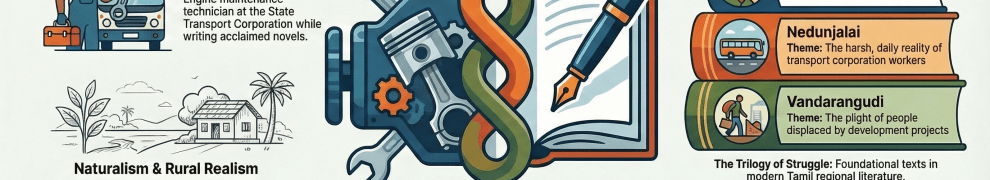 விவசாய மரபுகளும் இயற்கைச் சீரழிவும்: மணிலா சாகுபடி, நீர் மேலாண்மை போன்ற விவசாயத்தின் நுணுக்கங்களை இவரது கதைகள் மிகத் துல்லியமாகப் பதிவு செய்கின்றன. அதே சமயம், தொழில்மயமாக்கலால் இயற்கை அழிவதையும், “செம்புலம்” நிலக்கரிப் புழுதியால் மூச்சுத் திணறுவதையும் இவரது கதைகள் வேதனையுடன் பதிவு செய்கின்றன.