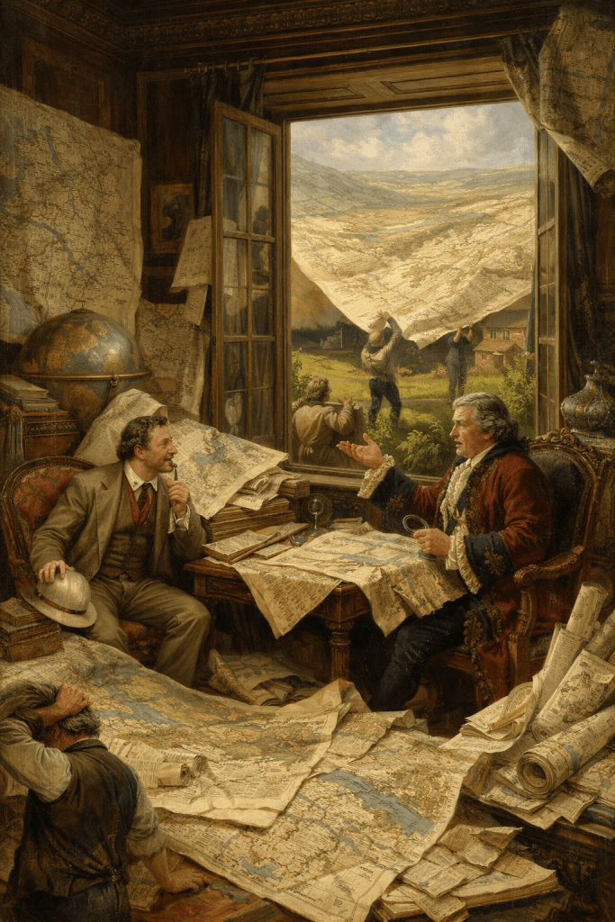 “ஆறு இஞ்சுகள் மட்டுமா!” என்று வியப்புடன் கூறினார் மைன் ஹர். “நாங்கள் விரைவிலேயே ஒரு மைலுக்கு ஆறு யார்டுகள் என்ற அளவை எட்டினோம். பிறகு ஒரு மைலுக்கு நூறு யார்டுகள் என்று முயன்றோம். அப்போதுதான் எல்லாவற்றிலும் மிகப் பிரம்மாண்டமான எண்ணம் உதித்தது! நாங்கள் உண்மையிலேயே நாட்டின் வரைபடத்தை, ஒரு மைலுக்கு ஒரு மைல் என்ற விகிதத்தில் உருவாக்கினோம்!”