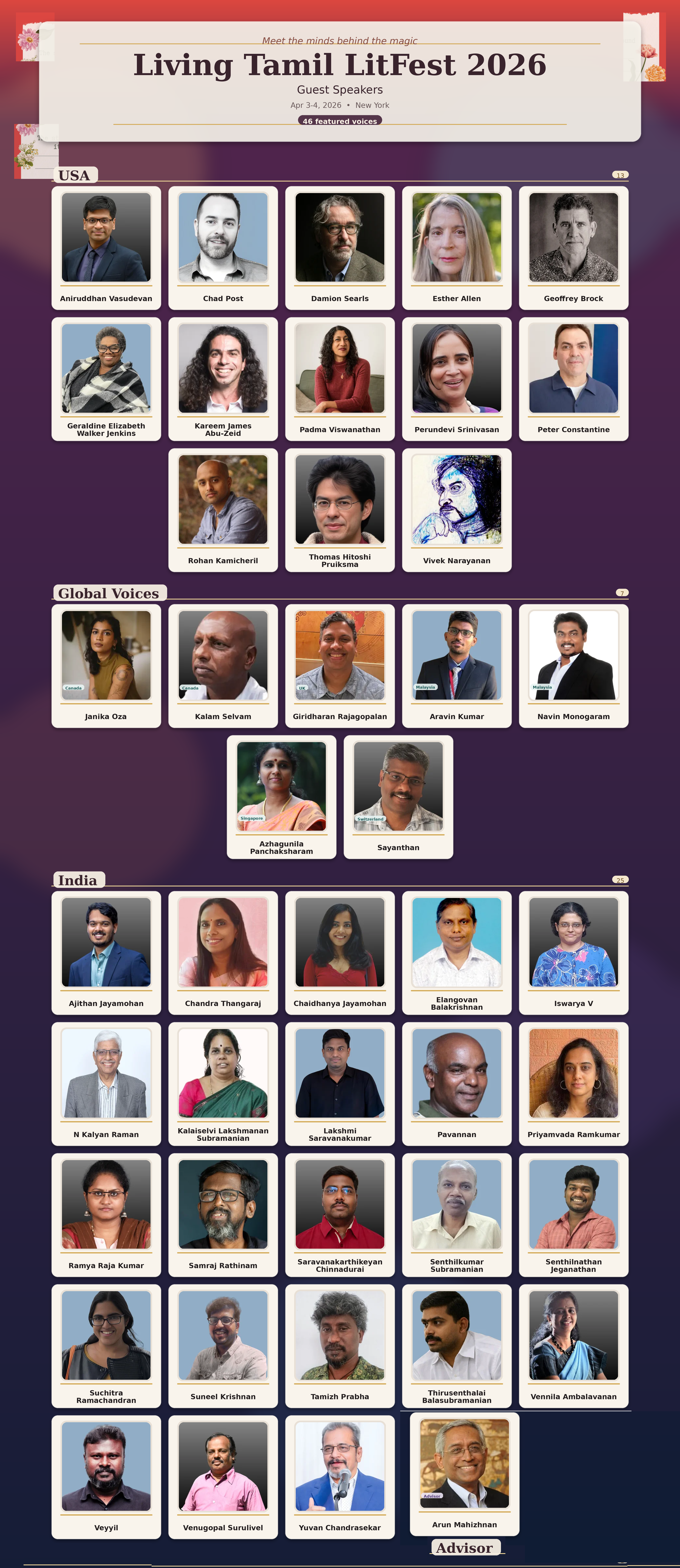 சங்கப் புலவர்கள் — காதல், தத்துவம், இயற்கை — என்ற நுட்பத்துடன் எழுதினார்கள்; ஐரோப்பிய இலக்கியத்தில் இது போன்ற நுட்பம் இன்னும் ஆயிரம் ஆண்டுகள் கழித்தே தோன்றியது. திருவள்ளுவரின் குறள் — அடர்த்தியான நெறிமுறை தத்துவத்தின் படைப்பு, கவிதையாகவும் படிக்கலாம், ஆட்சிக்கும் பயன்படுத்தலாம் — எழுபது மொழிகளில் மொழிபெயர்க்கப்பட்டும் இன்றும் வியப்பூட்டுகிறது. இது ஒருபோதும் மேதைமை குறைந்திராத மரபு. சில நேரங்களில் இந்தத் தொடர்ச்சிக்கு சற்றே சறுக்கலுண்டு — குறிப்பாக அதன் புலம்பெயர் வடிவில் — சந்திப்பின் உள்கட்டமைப்பு: நிறுவனங்கள், மேடைகள், எழுத்தாளர்கள் ஒருவரையொருவர் நேரில் பார்த்துப் பேசக்கூடிய ரத்தமும் சதையுமான அறைகள்.