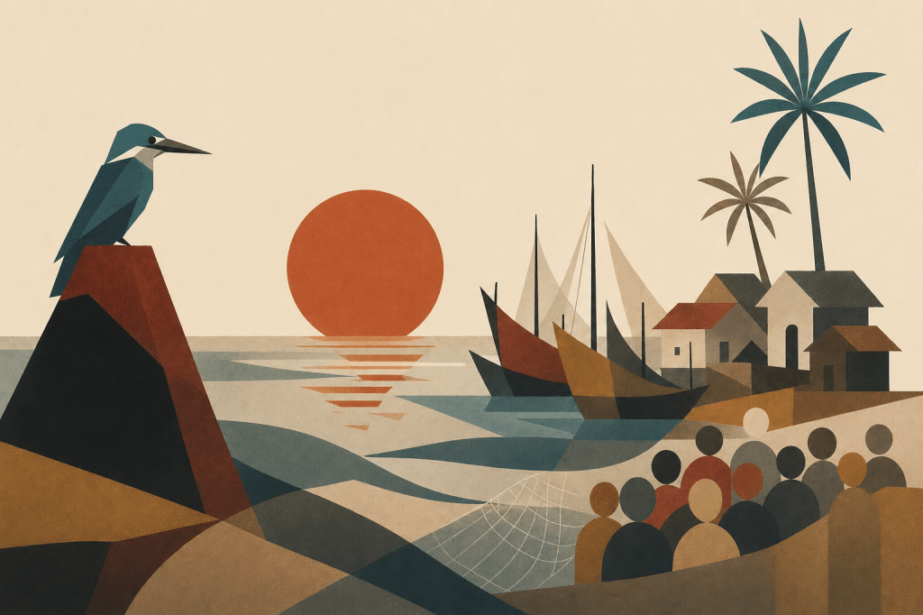ஊரின் கீழ்ப்பக்கம், சுட்ட செம்மண் பாறை ஒன்றின் மேல், ஒரு **மீன்கொத்திப் பறவை** ஓயாது அமர்ந்திருந்தது. அதன் கண்கள் கடலையும் ஊரையும் ஒரே நேரத்தில் பார்த்துக்கொண்டிருந்தன — ஆனால் அது வேட்டை ஆடவில்லை. பார்த்துக்கொண்டே இருந்தது. கொத்தாமல், கூவாமல், அசையாமல். ஊரிலே சிலர் சொல்வார்கள் — *”அந்தப் பறவை மீன்காட்டின் சாட்சி. கடல் தெய்வத்தின் பார்வை அதன் மூலமாகத்தான் ஓடுகிறது”* என்று. யாரும் அதை விரட்டியதில்லை; யாரும் அதை வணங்கியதுமில்லை.